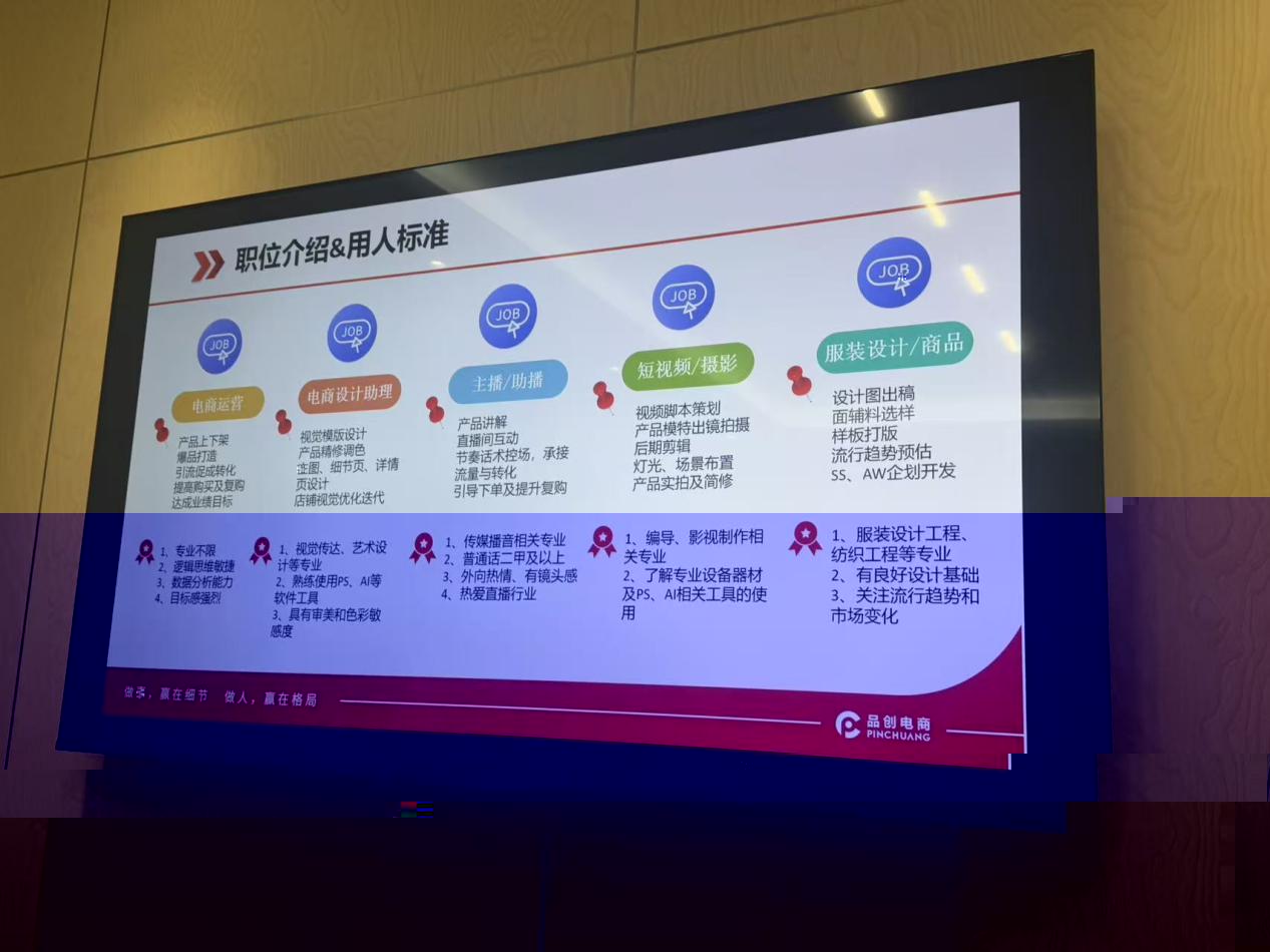 見習尾聲,一場幹貨滿滿的座談會在企業會議室舉行。品創電商人力發展經理陳玉曼圍繞企業文化、優秀員工成長案例及行業人才需求趨勢,與師生們展開深入交流。她結合企業實際,分享了一位從實習生成長為業務骨幹的案例,鼓勵同學們在校期間紮實學習、積極實踐。同時,她特别指出:“當前電商行業最需要的是複合型人才,未來的從業者不僅要掌握數據分析、營銷策劃、客戶管理等技能,還需具備跨界思維和快速适應市場的能力。”現場展示的服裝設計、商品管理、短視頻攝影、主播助播、電商設計助理等崗位的用人标準,也為同學們指明了學習與發展的方向。